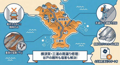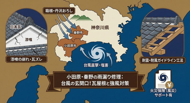 神奈川県の西部に位置するこの地域は、海からの風と山からの風が交差する、気象条件の厳しいエリアです。特に台風シーズンには、関東のどこよりも早く暴風域に入ることが多く、「風による屋根被害」が後を絶ちません。また、昔ながらの立派な瓦屋根が多いのもこの地域の特徴です。