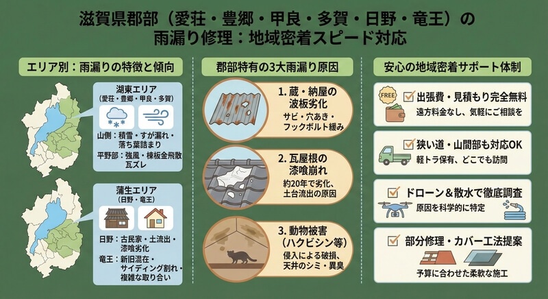 私たちは滋賀県全域をカバーしており、郡部エリアももちろん出張費無料・即日対応エリアに含まれます。これらの地域は、築年数の長い立派な日本家屋や、農機具倉庫・蔵を併設した住宅が多く、市街地とは違った「重厚な屋根」特有の雨漏りトラブルが見られます。