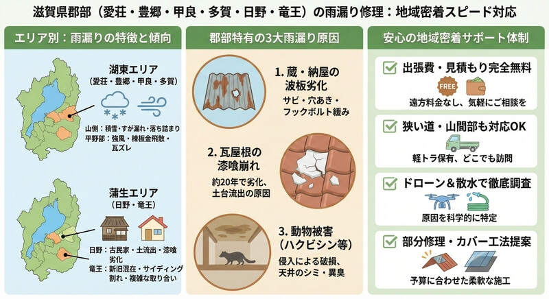 高島市は、琵琶湖と比良山系に挟まれた地形により、「比良おろし」と呼ばれる局地的な強風や、県内有数の積雪・凍結の影響を受ける地域です。この厳しい気象条件は、南部エリア(草津・大津南部)とは異なる雨漏りの発生メカニズムを生み出し、一般的な修理方法では再発してしまうケースも少なくありません。