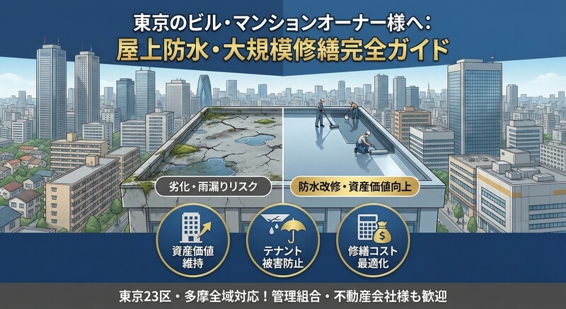 東京都内でビル・マンション・アパートを所有するオーナー様、不動産管理会社様、そして管理組合の理事様。建物の「屋上(陸屋根)」のメンテナンスは万全でしょうか?